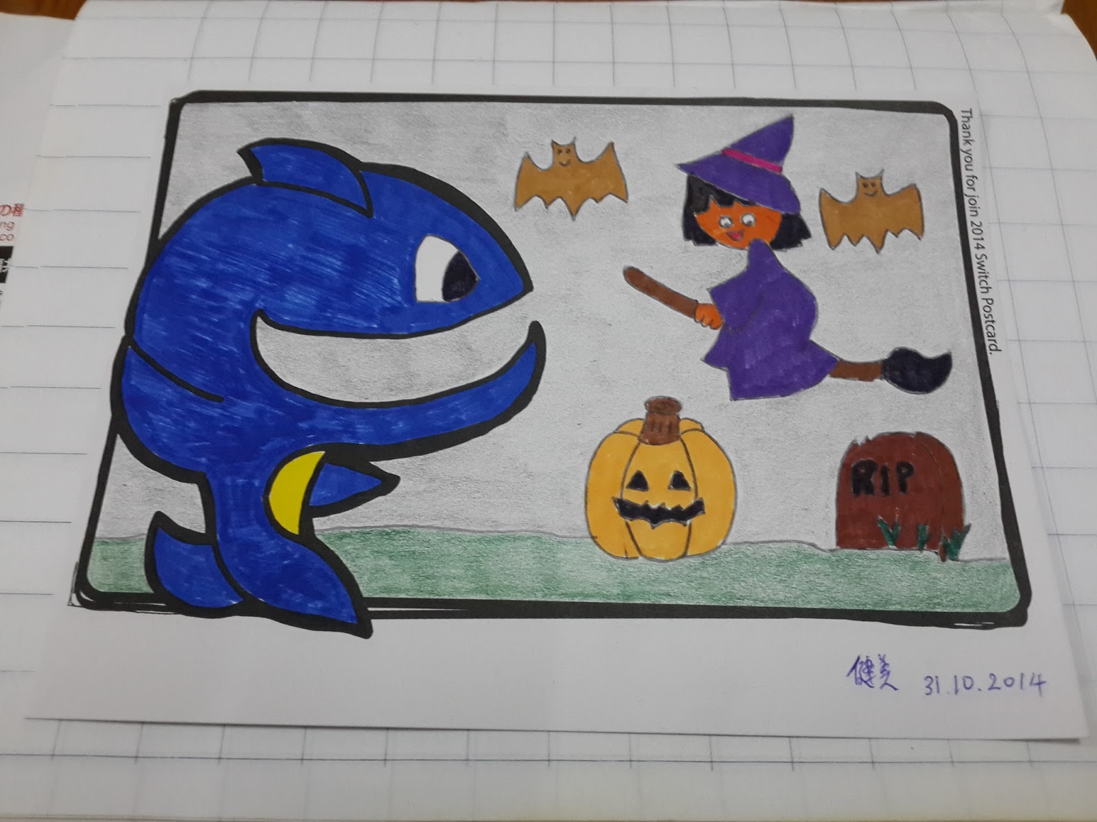 festival so I draw a witch, graveyard, pumpkin and bats. Below is my drawing process of artwork